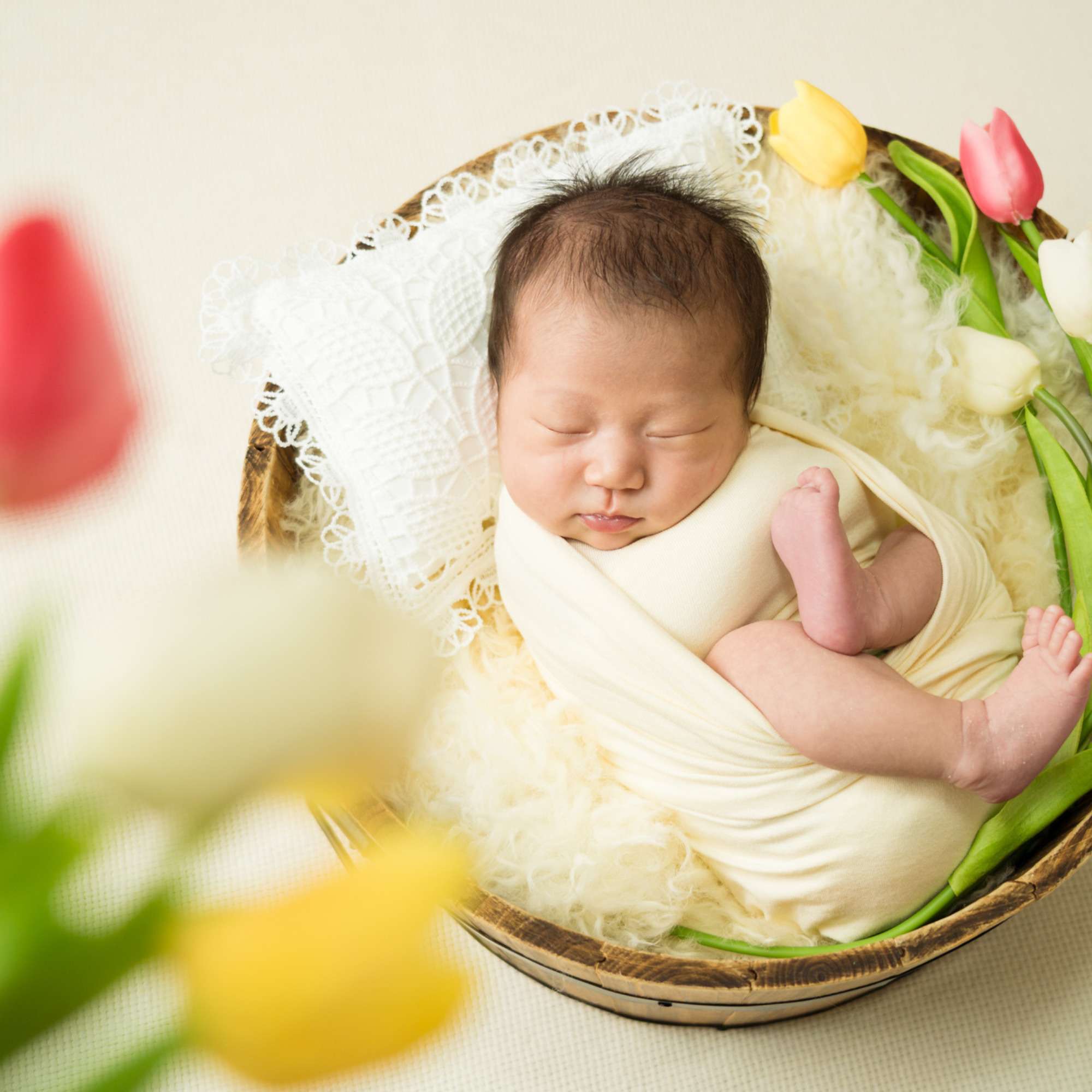 生まれたての小さな命を、やさしいホワイトとクリームの色合いでそっと包み込む、ニューボーン撮影セットです。木のかごに身を委ね、ふんわりと眠る姿は、今しか見られない尊い一瞬。繊細なレースと温もりのあるニット、やわらかなチューリップが、赤ちゃんの純真無垢な美しさを引き立てます。派手な演出はせず、赤ちゃん自身の愛おしさを大切に。初めての「家族の宝物」となる写真を、安心できる空間で丁寧に残します。